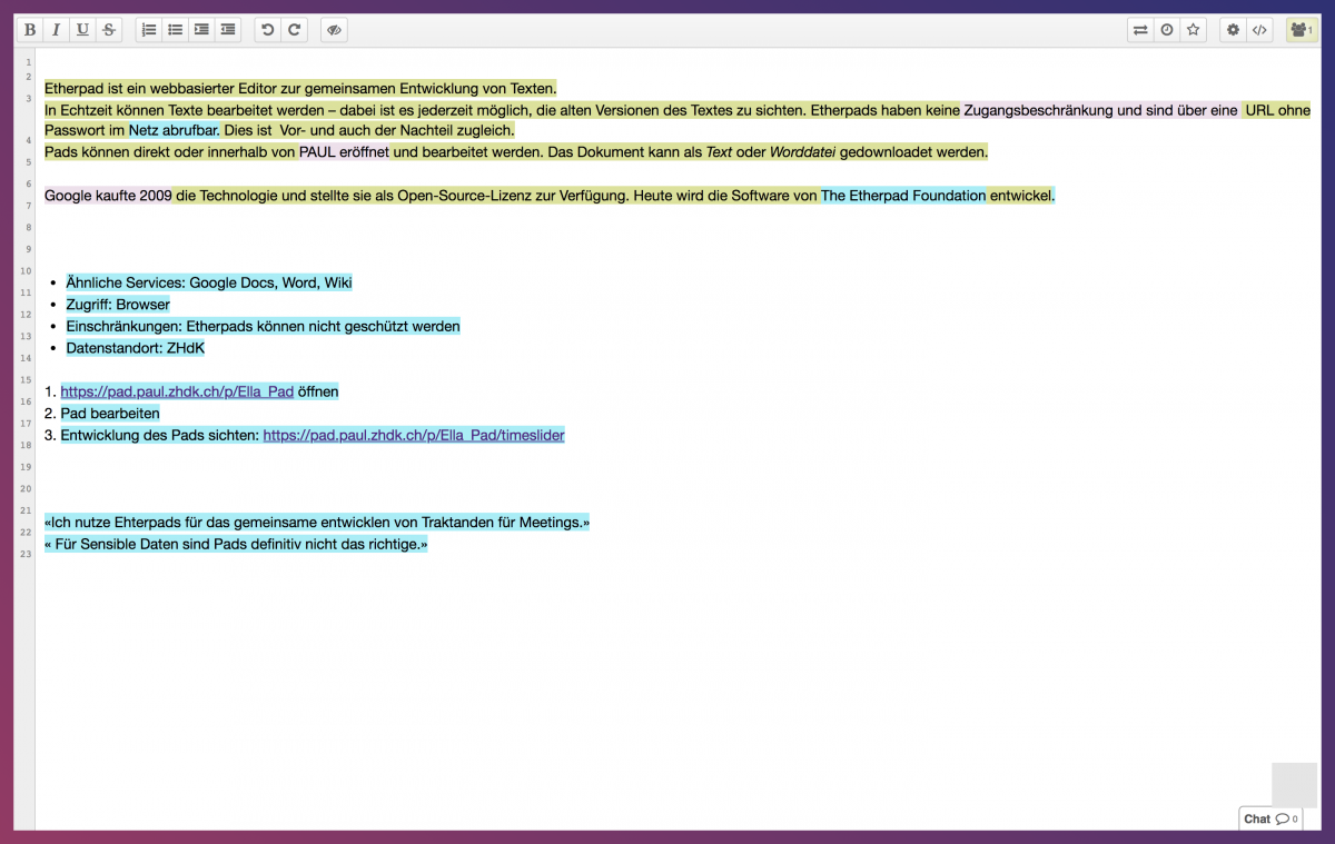 Etherpad is a web-based editor that allows you to develop texts with others. You can edit texts in real time and view the old versions at any time. Pads have no access restrictions, and can be accessed via a self-chosen or cryptic URL without a password in the web. This openness is both an advantage and a disadvantage. Pads can be opened and edited directly in the browser or in PAUL. The document can be downloaded as a text or Word file.