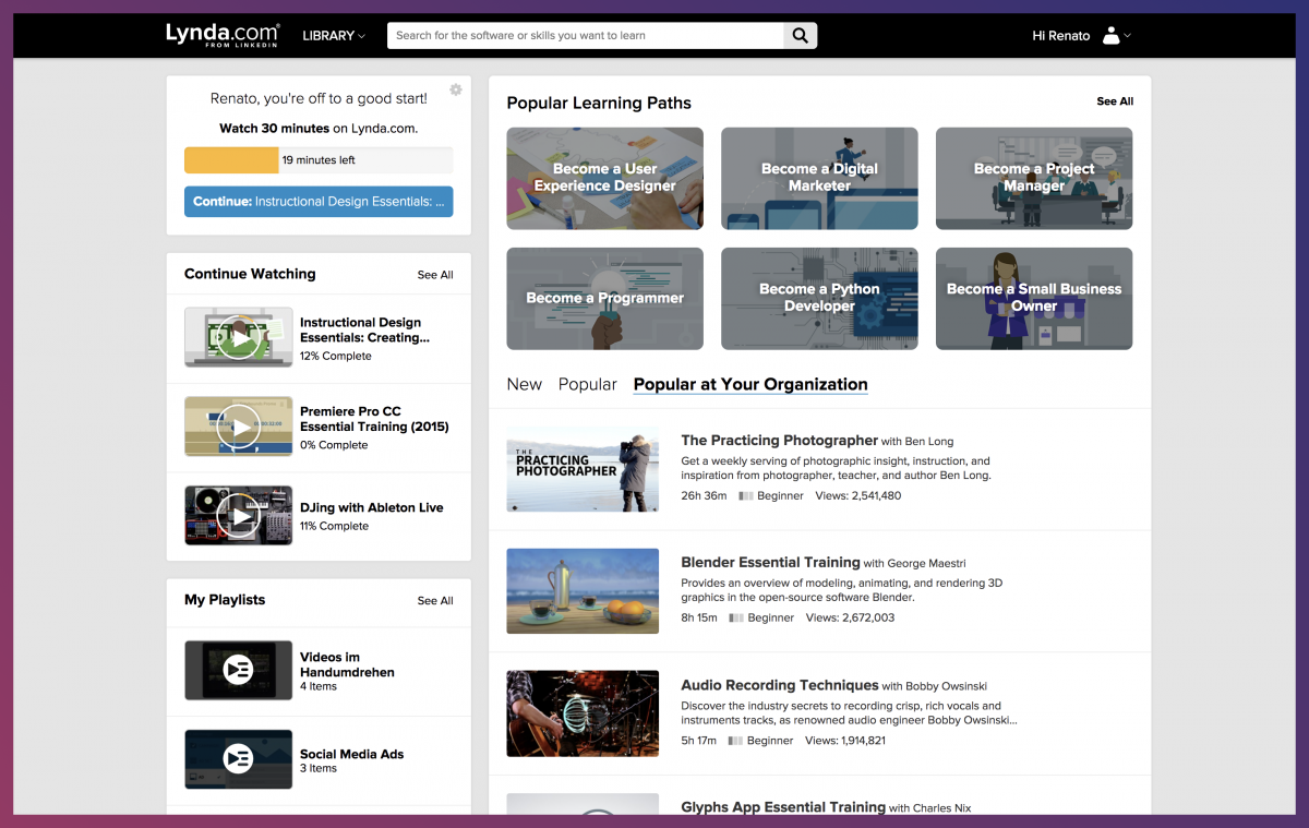 LinkedIn Learning offers a range of video tutorials in different languages. Topics include: software training sessions, programming, project and self-management.