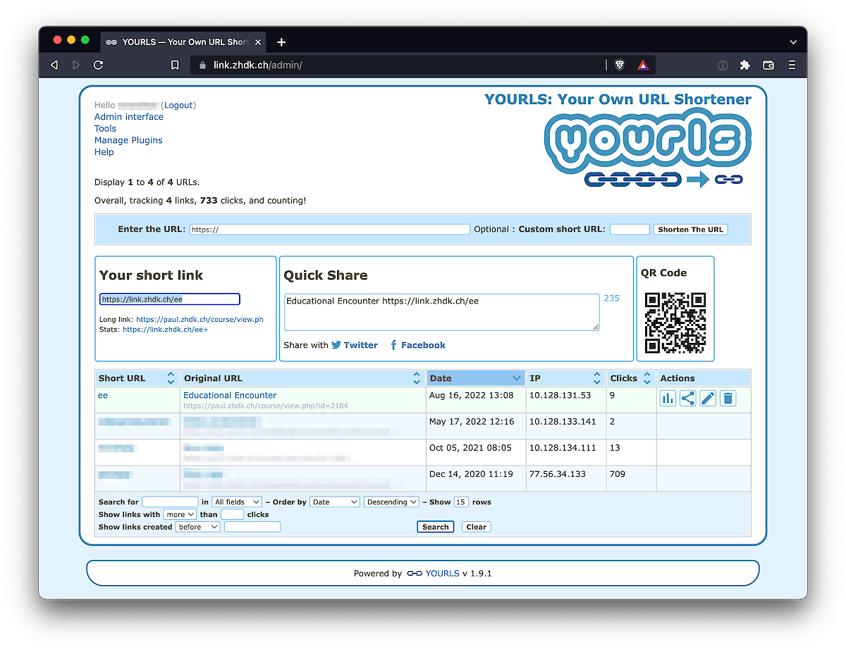Every member of ZHdK can shorten long internet addresses or make cryptic links readable with the URL shortener “YOURLS”. After setting up a redirect, a QR code is automatically created. It can be printed on printed material such as flyers or stickers, if required. The target address of the redirect can either be accessed by entering the short URL in the browser or by scanning the QR code. Every redirect is available as a statistic via page views/time.