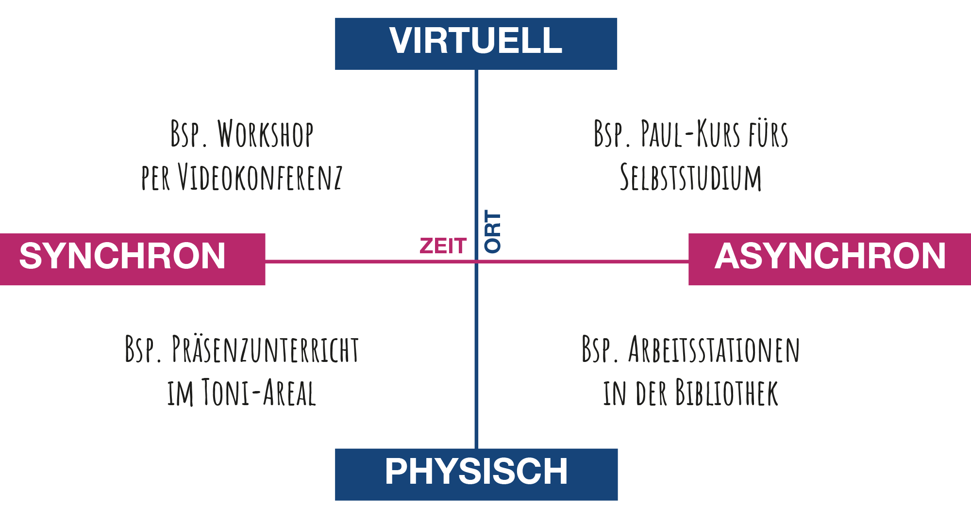 Eine Klasse mit 10 Personen wird in zwei Gruppen geteilt. Abwechselnd nehmen die Gruppen in wöchentlichen Treffen [physisch/synchron] vor Ort im Toni-Areal oder per Zoom [virtuell/synchron] teil. Dazwischen gibt es Selbstlernphasen, die durch digitale und analoge Lernmaterialien unterstützt werden [virtuell/asynchron].