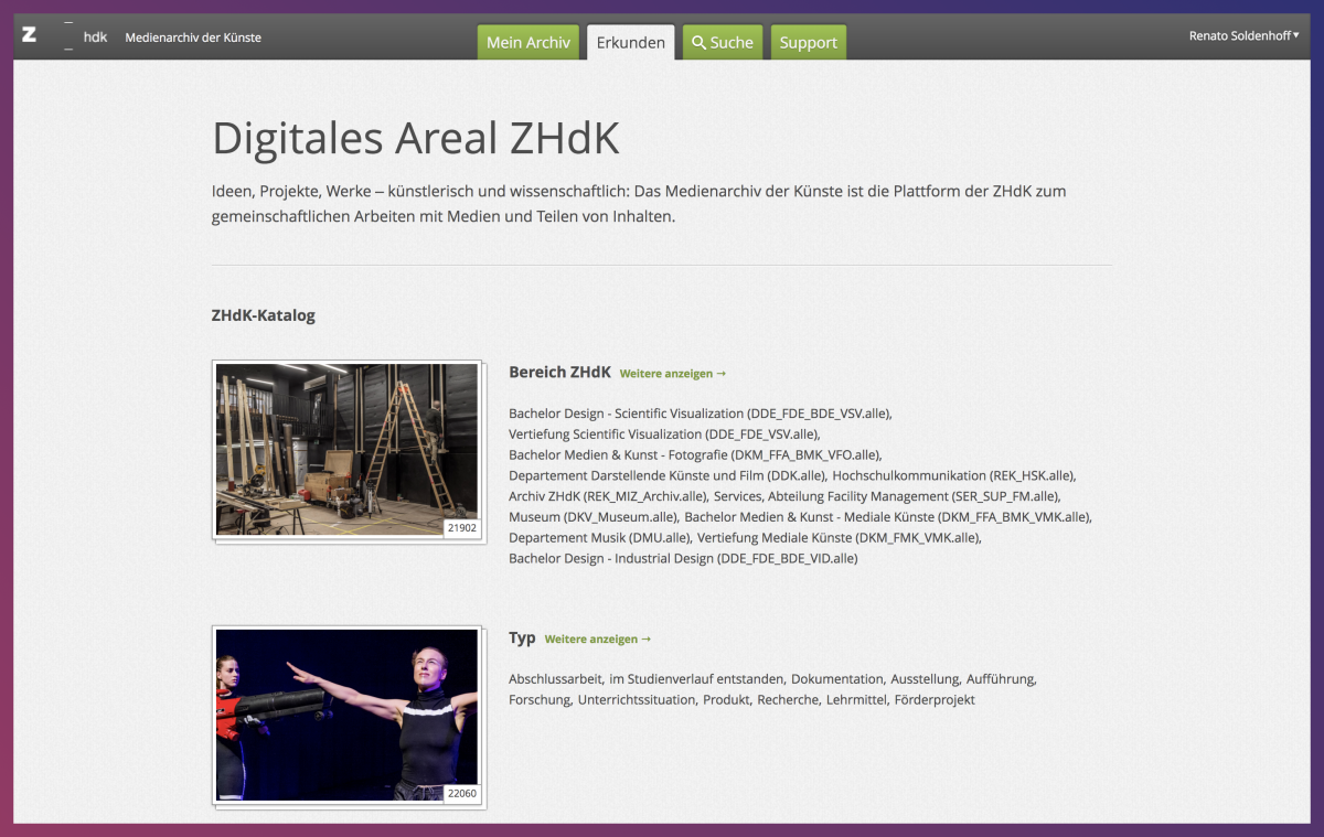Das Medienarchiv ermöglicht es Angehörigen der ZHdK, Medien zu archivieren und sie mit anderen Studierenden und Mitarbeitenden oder aber öffentlich zu teilen. Dabei können Bilder, Videos, Audio-Files und Dokumente hochgeladen werden. Zusammengehörige Medien können zu einem Set gebündelt und gemeinsam verschlagwortet werden. Zugriffsberechtigungen und Lizenzen der Medien können detailliert festgelegt werden. Zudem bietet das Archiv eine Langzeitbetreuung der digitalen Medien an und sichert so den nachhaltige Aufbewahrung – besonders hilfreich ist dies bei Videodateien.