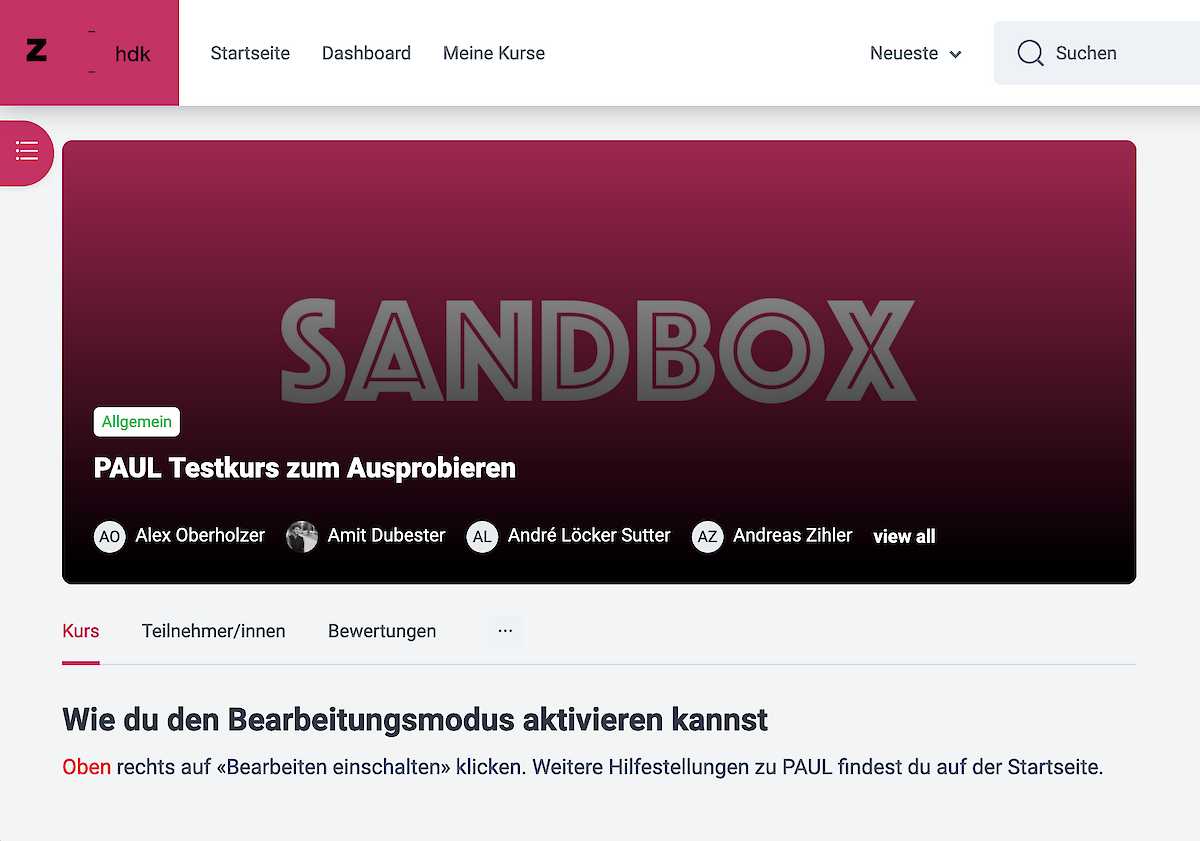 PAUL basiert auf der Software Moodle und wurde speziell den Bedarfen der ZHdK angepasst. Alle Angehörigen der ZHdK können über PAUL online Kursräume anbieten oder an solchen Teilnehmen. In den Kursen werden Arbeitsmaterialien und Lernaktivitäten verwaltet. Es können hier beispielsweise Inhaltsseiten angelegt werden, ein Forum bietet aber auch Raum zur Diskussion. Es lassen sich Aufgaben, Tests oder Lektionen definieren und anlegen. Über Wikis, annotierte Inhalte oder das Hochladen oder Einbetten von externen Materialien lässt sich Kursmaterial zur Verfügung stellen und aufbereiten. Auch können über Paul automatisch Mails an alle eingeschriebenen Teilnehmenden versandt werden. Die Vielfalt an Möglichkeiten und Einstellungen ermöglicht es, unterschiedlichste didaktische Situationen zu gestalten.