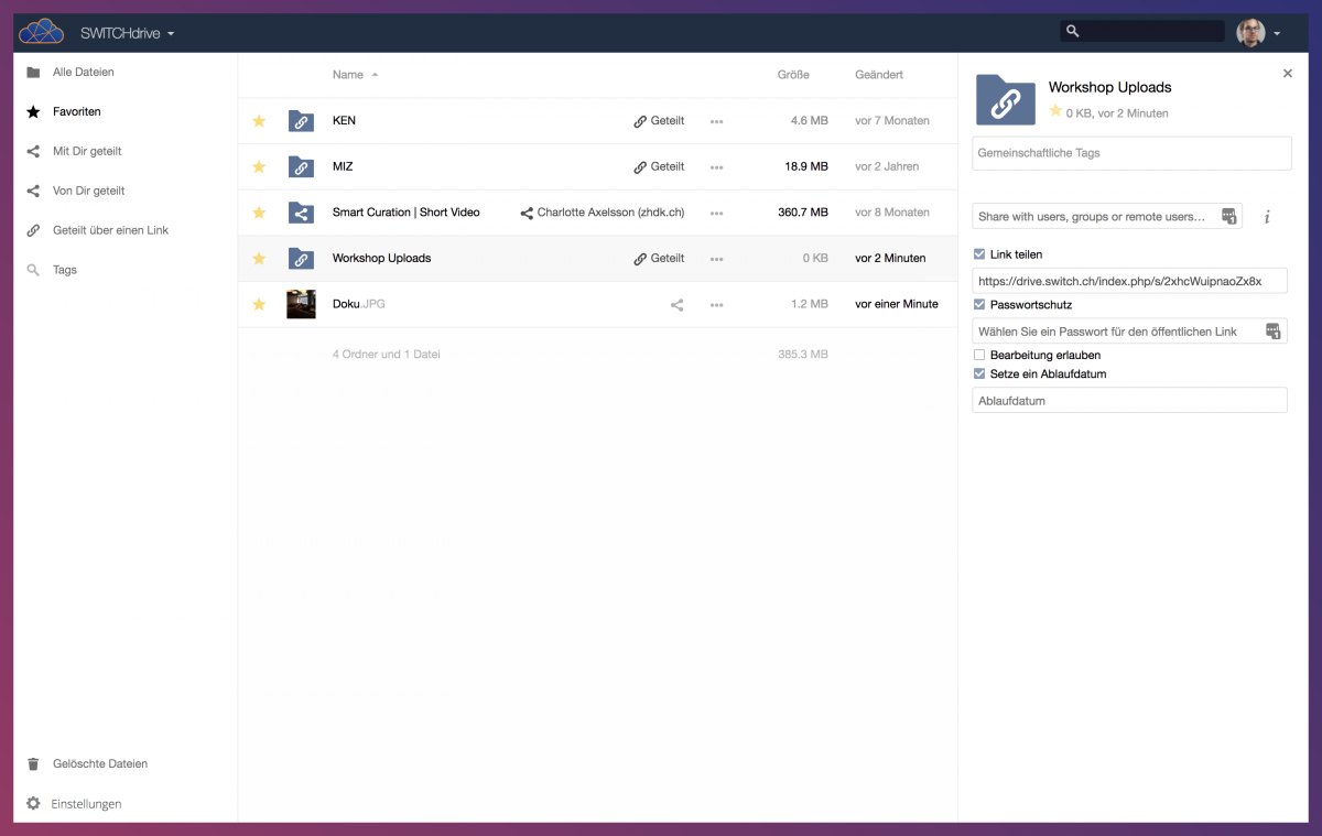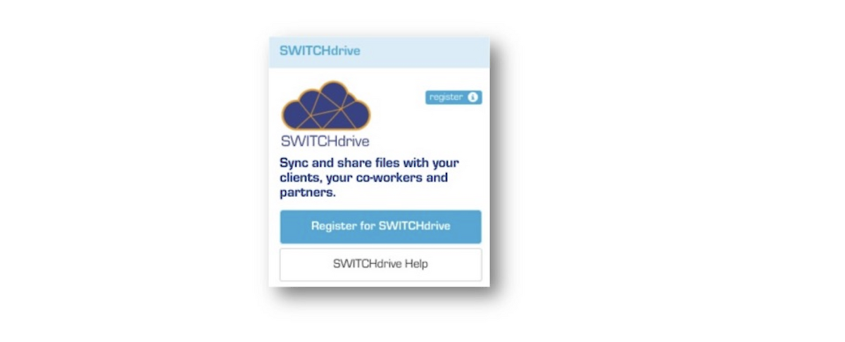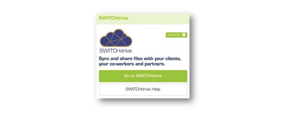 SWITCHdrive ist ein Cloud-Service zum Online-Speichern von Daten. Hier können Dateien einzeln abgelegt oder ganze Ordner hochgeladen werden. Dateien können mit anderen Nutzer*innen geteilt, per Link frei zur Verfügung gestellt oder durch ein Passwort geschützt werden.
